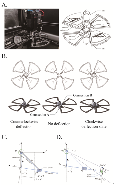 近日,mk手机注册深圳国际研究生院弥胜利课题组通过设计一种新型可偏转的离心微流控系统(图1),通过控制伺服电机相位角差就能实现芯片工作平台的逆时针偏转、无偏转、顺时针偏转三种状态,其中逆时针偏转和顺时针偏转可通过改变相位角差大小实现位姿偏转角的控制,借由实现微流控芯片阀门的开关。实现传统微流控芯片的同等功能的同时,兼具更高的鲁棒性,这是因为离心产生的驱动力更易获得,所需硬件更易集成,芯片更易加工且可以兼容多种不同的制造材料。
