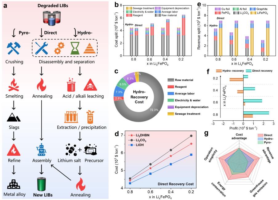 图5. 火法、湿法回收以及本工作提出的直接再生策略的经济性分析