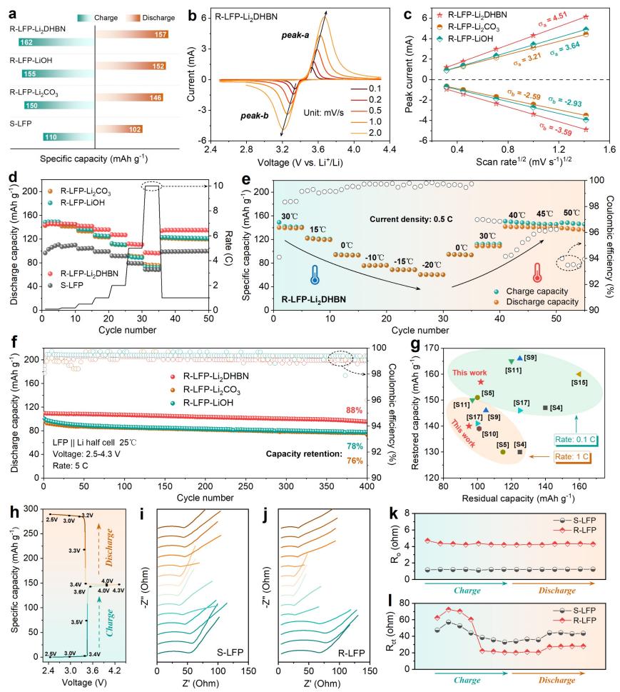 近日,mk手机注册深圳国际研究生院周光敏、成会明团队提出了使用一种新型的多功能有机锂盐(3,4-二羟基苯腈二锂,Li2DHBN)直接修复失效LFP正极的方法。有机锂盐表面丰富官能团(如-CN,-OLi)可以和失效LFP颗粒有效地耦合,且有机锂盐在较低温度下分解为无定形碳和碳酸锂,在较高温度下进一步分解为氧化锂,即达到“低温包碳+高温补锂”的双重效果。此外,具有还原性的氰基官能团在还原三价铁的过程中起到关键作用。修复后的LFP正极具有优异的循环稳定性和倍率性能,在5C下循环400次后容量保持率为88%,这得益于锂的有效补充、三价铁的还原、电子导电性的提升。这种策略也适用于直接修复过渡金属氧化物层状正极材料,证实了该有机锂盐的通用性。相比于传统的火法和湿法过程,该工作提出的策略具有更高的经济价值和更大的环境效益,为未来探索更多不同锂源用来直接修复失效锂离子电池正极材料提供了独特的思路。