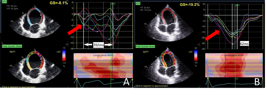 CLBBB儿童术前与术后心脏彩超的应变图形对比(红色箭头)A图为术前-应变曲线显示心室收缩杂乱无章;B图为术后-应变曲线显示心室收缩统一