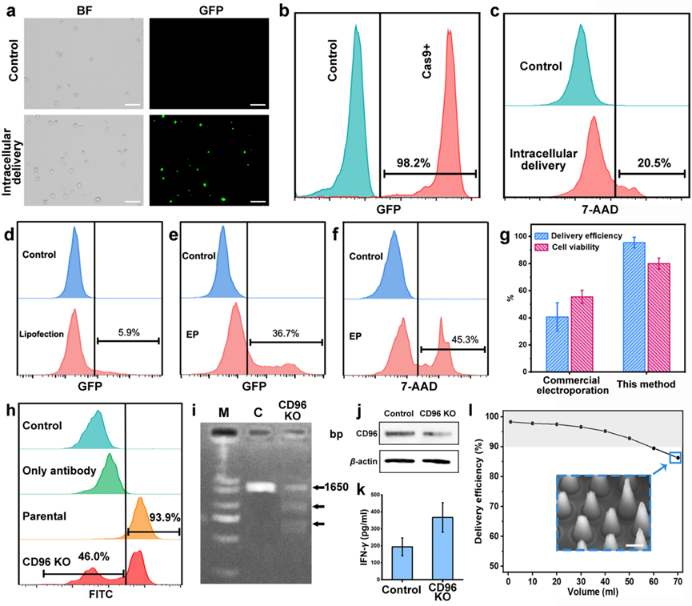 细胞免疫疗法在肿瘤治疗中已取得重要突破,成为最有希望消除肿瘤的治疗方法之一,而胞内递送及目标基因编辑是细胞免疫治疗技术流程中的关键前提步骤。但对于具有高度抗性的自然杀伤细胞(Natural Killer Cell,NK细胞),现有方法仍存在着递送效率不足、转染通量低、细胞损伤大、不适用于悬浮细胞等问题,这在一定程度上阻碍了细胞免疫疗法的快速发展。