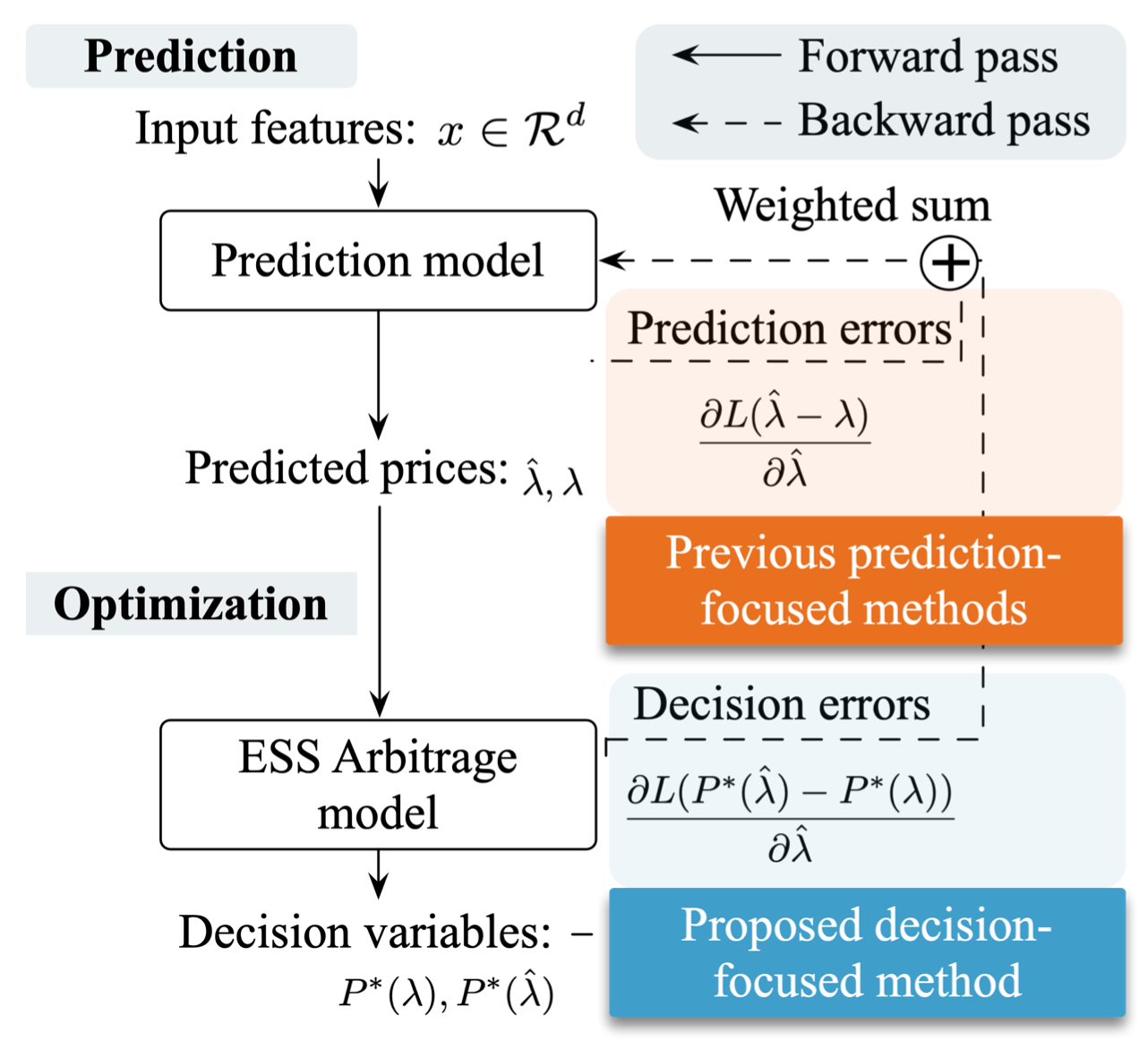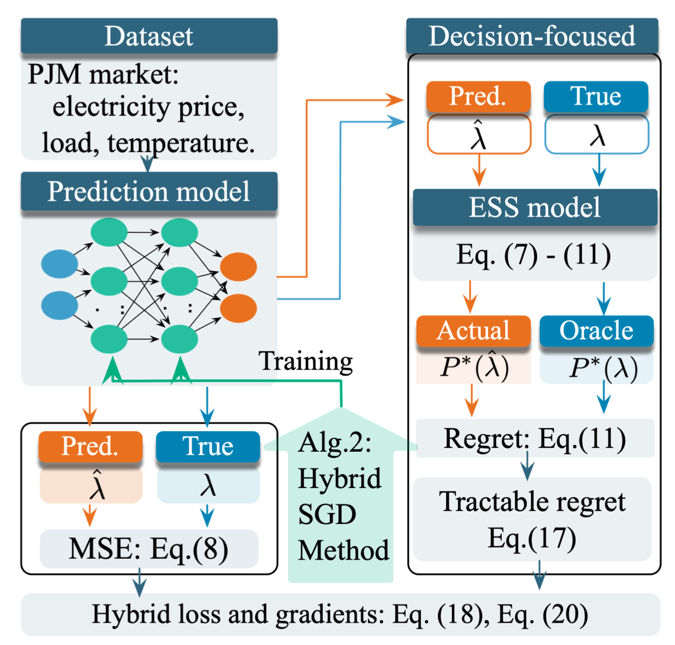 近日,mk手机注册深圳国际研究生院许银亮副教授团队联合机器学习和优化理论提出半端对端的电力系统运行控制理论和模型,有效提升电力系统运行的经济性和安全性。在电力系统储能运行场景下,团队通过考虑下游优化模型的反向影响,提出了一种面向储能套利的电价预测方法,该方法基于模型决策误差和预测构建混合损失函数,用于衡量组合的决策和预测错误。基于该损失函数提出混合随机梯度下降学习方法用于训练预测模型,包括两次反向传播和一次模型更新。数值实验表明,该方法可以准确预测价格变化趋势,并通过平衡预测误差的日时间分布有效提高决策精度。与基于传统的模型相比,以决策为中心的电力预测方法可以带来更多的经济效益并减少预测误差。