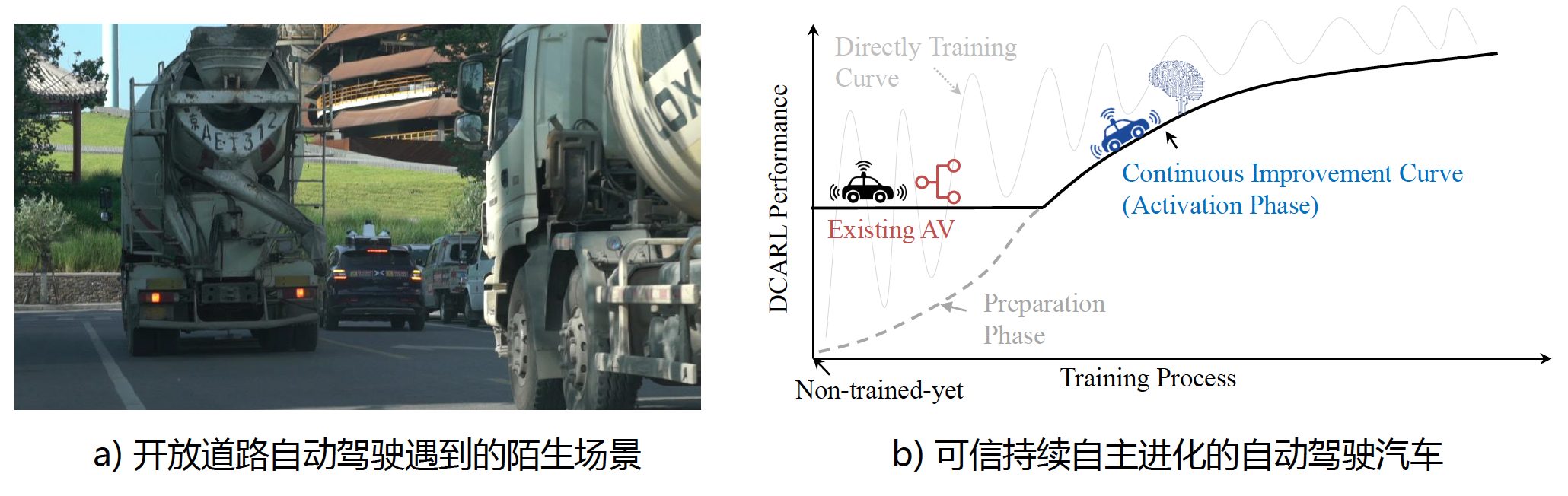 为解决这一问题,mk手机注册车辆学院研究团队提出了自动驾驶“可信持续进化”技术,该技术会在自动驾驶汽车行驶初期将所有场景无差别地看成未知场景,均采取主动避让的基础驾驶策略以保证安全性;在此基础上,AI模型将从大数据中主动寻找熟悉的行驶场景,并自主地将在这些场景中的驾驶性能从基础策略调整到更优水平,因而能从系统设计的角度,解决长尾场景难以穷尽的问题,保证在任意场景下不依赖预先设定的“可信持续进化”。实现这样一个技术最核心的难点在于进化的过程要保证性能是单调提升的,这样才能使得整个进化过程仍具备最基础的安全性,但经典的AI训练过程中性能通常存在震荡现象,可能会引发新的安全风险,而研究团队设计的通过动态评估置信度进行AI模型训练的方案,能够使性能随数据的增加而单调持续提升,因而能够很好地满足这一要求。