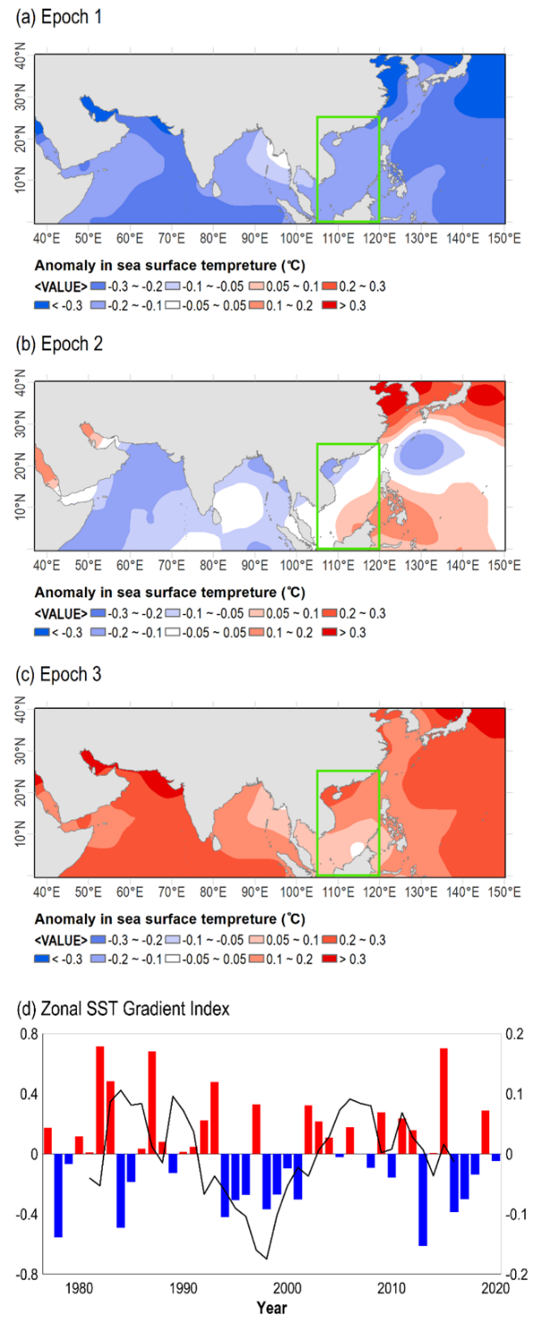 南海引导气流的年代际变化主要归因于西太平洋副热带高压的东西向摆动。当西太平洋副热带高压减弱东退并远离南海时,副热带高压西南侧的压力梯度较小,从而诱导较弱的引导气流,反之亦然。这一变化很可能是由北太平洋和西北太平洋海域之间的纬向海温梯度驱动的。该研究进一步提出了一个新的海表温度纬向梯度指数,该指数定义为北太平洋和西北太平洋海域之间的纬向海温梯度(图3)。结果表明,这一新的海表温度纬向梯度指数能够较好地刻画我国南海地区台风移动速度的年代际变化特征,对于南海台风移动速度的未来预测预估和长时间尺度历史数据重构具有重要指示意义。