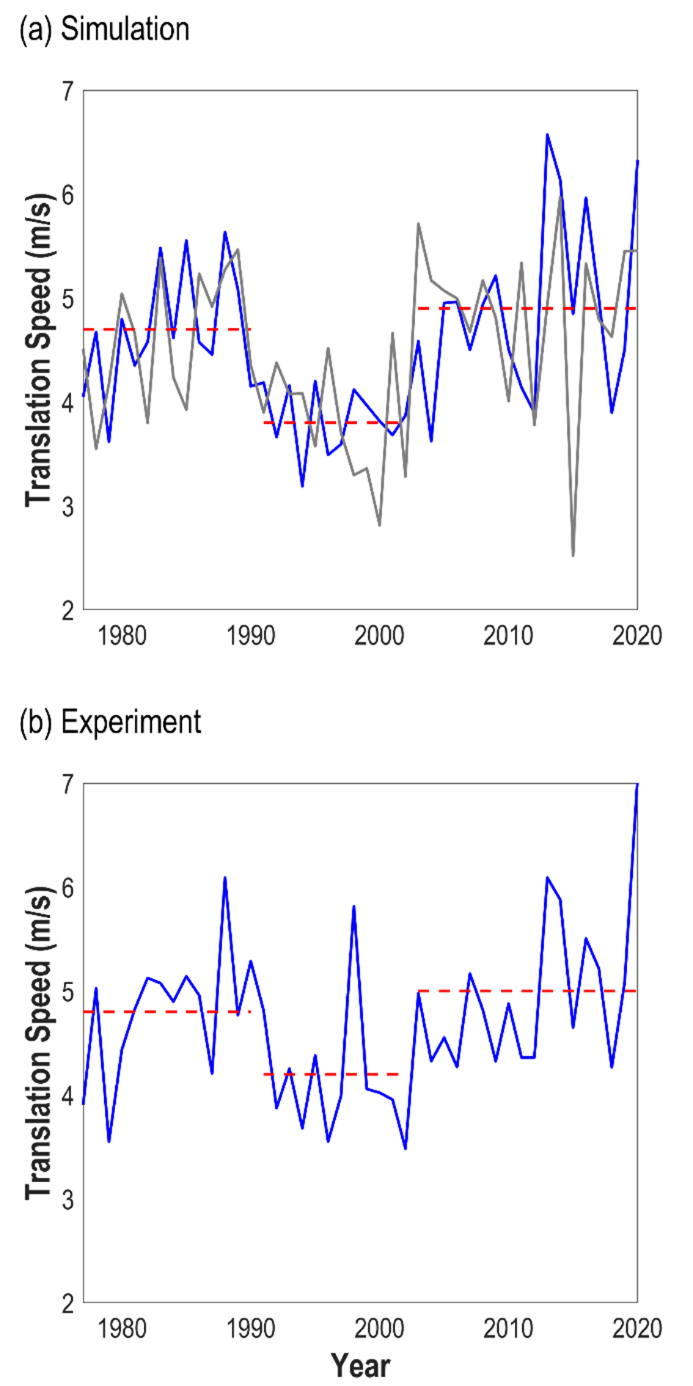 图2.基于自主建立的台风路径模型模拟南海台风移动速度年代际变化与实测数据吻合