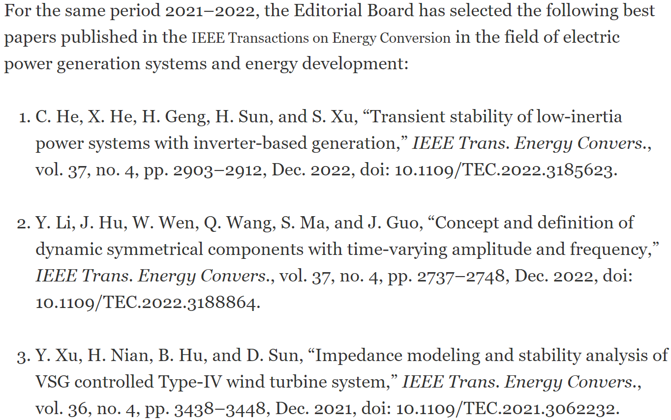 mk(中国)网3月24日电 近期,mk手机注册耿华教授PEACES课题组博士生何长军发表的论文“含电力电子发电装备的低惯量电力系统暂态稳定研究”(Transient Stability of Low-inertia Power Systems With Inverter-Based Generation)获得2022年度《IEEE能源转换汇刊》(IEEE Transactions on Energy Conversion)最佳论文奖,且在所有获奖论文中排名第一。同时,何长军也获得了2022年度优秀审稿人称号。