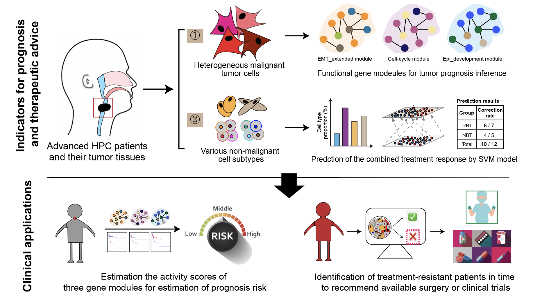下咽癌因其病发位置隐蔽且早期症状不明显,导致患者诊断时多为中晚期,是头颈部鳞状细胞癌中预后最差的亚种。现阶段,中晚期下咽癌的一线治疗以TPF(铂类、紫杉醇、5-氟尿嘧啶等)诱导化疗叠加EGFR(表皮生长因子受体)靶向治疗,即联合治疗方案为主,但临床实践中仅有约半数的患者对治疗方案有响应。疗效不佳的患者错过了手术或其他治疗方案的最佳窗口而导致病情恶化,身心和经济承受了巨大压力。针对该临床难题,谢震和黄志刚课题组,分别发挥其在肿瘤组学数据分析建模和头颈临床外科诊疗的研究优势,通过多转录组数据的获取和分析,从肿瘤细胞和肿瘤微环境两个方面对下咽癌组织内部的分子和细胞特征进行了详细刻画,筛选了下咽癌预后的标志物,建立了下咽癌联合治疗预测的定量评估模型。其中,下咽癌联合治疗评估模型的建立是基于肿瘤微环境中保守性较强的非肿瘤细胞亚型占比,通过机器学习中支持向量机模型与疗效相关联,在小规模前瞻性数据中取得了准确率高于80%的预测效果。该预测模型具有极大的潜在应用价值,将为中晚期下咽癌提供方便经济的分层诊疗指导;同时,作为整合跨模态信息提供数智精准外科治疗指征的实例,也将为建立定量化、智能化、精准化肿瘤外科的理论和方法提供新思路。