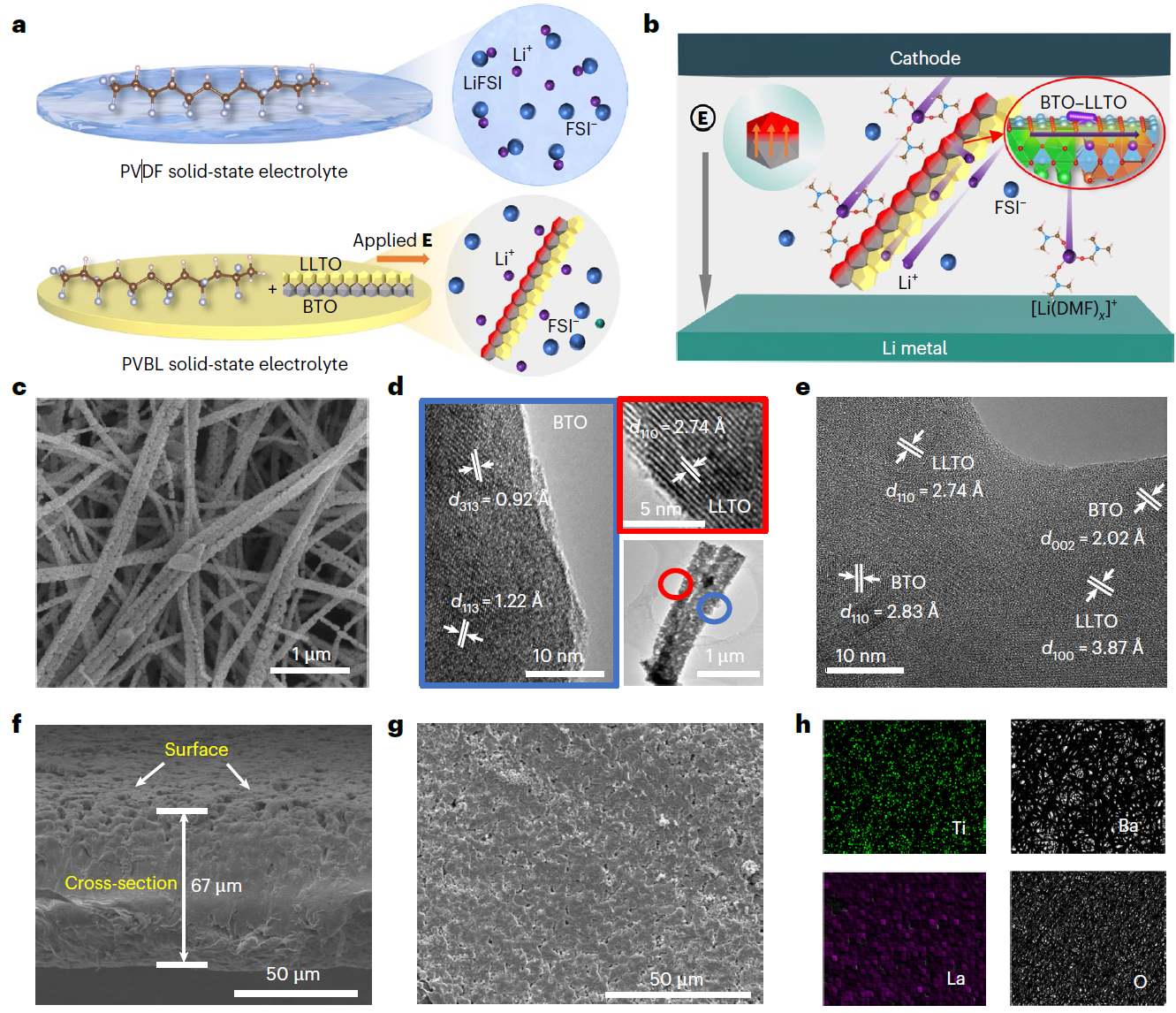 图1.具有并肩耦合结构的BaTiO3-Li0.33La0.56TiO3-x纳米线填料及其所构建的PVBL复合固态电解质结构表征