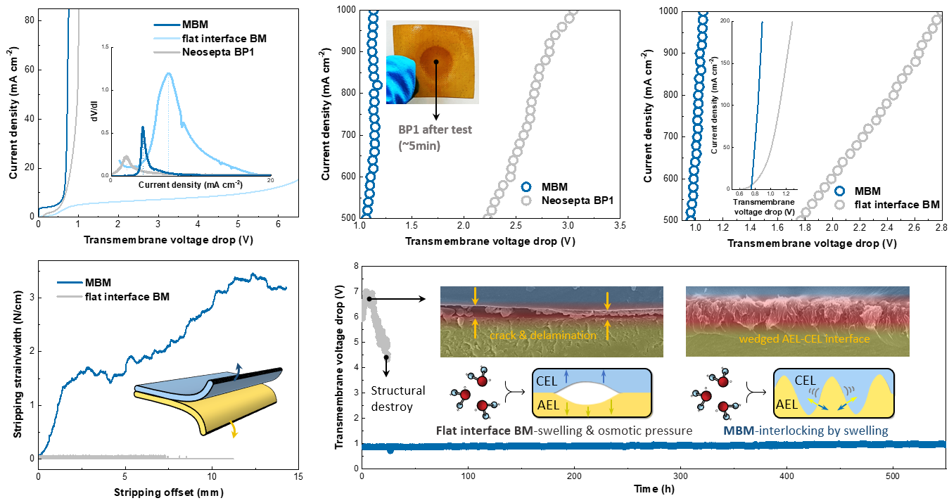 图2.物理互锁结构双极膜的水解离性能及长期使用稳定性