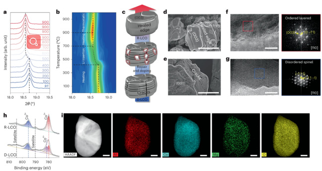 结合前期大量的实验结果与理论计算分析,研究团队首次提出利用失效材料本征结构缺陷降低掺杂元素扩散能垒,从而增强了原子扩散,并实现掺杂原子精准占位的功能化再生机制。该机制巧妙利用了失效材料由于长期循环造成的表面缺陷和内部锂空位等“不利”结构特征,使其为原子的定向扩散提供了通道。基于该机制设计的功能化再生方法,可以同步实现锂元素的补充以及关键原子的精准占位,在过渡金属层间提供支撑作用,大幅增强层状结构在高电压下大量脱锂时的稳定性,将失效钴酸锂一步再生为在4.6V高电压下超稳定的高电压钴酸锂,300圈循环后容量保持率依然可达80%,是目前同类材料(包含从商业前驱体制备的高压钴酸锂材料)报道的最佳结果之一(图1)。该方法大幅缩短了失效钴酸锂转化为高电压钴酸锂的流程,并将再生产物的经济价值提升了20%以上,对回收产物的功能化再利用具有重要的借鉴意义。