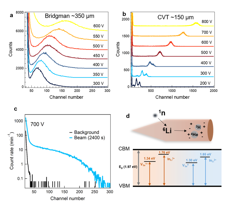 针对上述关键问题,mk手机注册材料学院李千副教授课题组联合工程物理系杨祎罡教授课题组等团队开发了一种大尺寸、高质量LiInP2Se6单晶的生长方法,通过Bridgman法制备出厘米量级的块体单晶,并实现了热中子探测原型器件的验证。研究中,通过调控Bridgman法生长工艺(过热温度、结晶温度梯度、坩埚结构设计和下降速度等)首次成功制备出直径达12mm、厘米级长度的大尺寸块体单晶(图1a)。扫描透射电镜(图1b)和劳厄相机(图1c)测试结果表明Bridgman法制备所得晶体具有优良的单晶性和均匀性。光学二次谐波产生测试(SHG,图1d)进一步揭示了Bridgman法生长应力的分布和影响。Bridgman法所得LiInP2Se6单晶对热中子具有鲁棒的辐射探测响应(图2c),显示其作为实用化固态中子探测器的潜力,此外通过alpha粒子轰击实验证实了单晶良好的耐辐照能力。对比CVT和Bridgman法所得单晶的alpha粒子响应数据可知(图2a、b),目前在探测性能方面CVT法所得单晶质量更优。缺陷的存在和种类会影响载流子信息收集,最终反映为对中子探测性能的影响。进一步的实验和理论计算结果表明Bridgman法对应的晶体生长环境更倾向于硒的缺失和铟的过量,易形成VSe0和InLi2+两种更深能级的缺陷(图2d)。缺陷能级越深,对载流子产生束缚作用越强,不利于载流子迁移,从而影响探测性能,缺陷机制的研究为进一步优化Bridgman单晶质量提供了重要依据。该工作开发了一种具有可控的、可放大性的LiInP2Se6块体单晶制备路线,进一步厘清了其晶体结构、电学性能和缺陷机制的关联,并验证了原型LiInP2Se6单晶探测器的实用化中子探测能力,从而对直接型中子探测材料及器件的研究进程作出重要推动。
