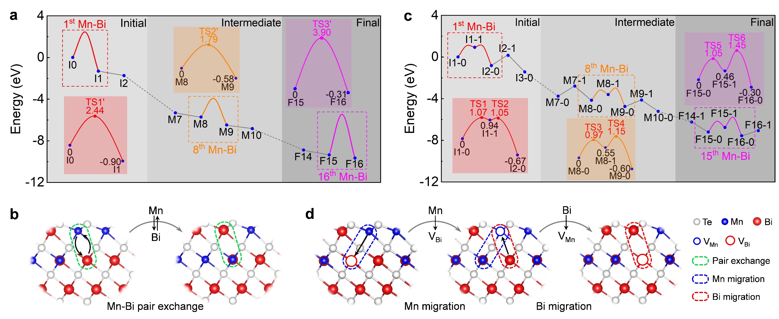 课题组成员还发现,空位缺陷(如MnTe/Bi2Te3中Bi空位和MnBi2Te4中Mn空位)能够显著降低相变过程中的动力学势垒。但是随着相变的进行,Mn-Bi交换的动力学势垒逐渐升高,且热力学释放的能量逐渐降低。当大部分Mn-Bi完成交换后,也即MnBi2Te4中存在稀浓度的MnBi和BiMn反位缺陷时,简单的退火并不能克服过高动力学势垒,使得最终退火所得的MnBi2Te4中出现大量难以消除的Mn-Bi混合反位缺陷(如图2)。过度的提高退火温度来克服动力学势垒并不能进一步提升MnBi2Te4样品质量。