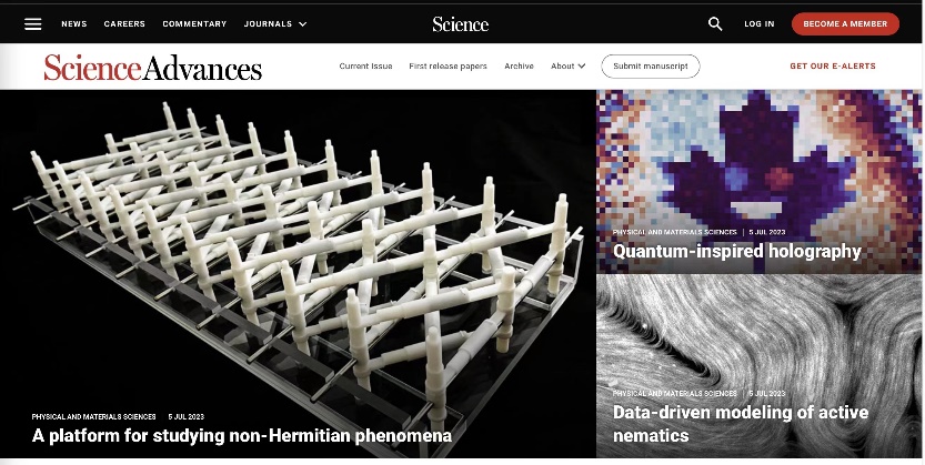 相关研究成果以“静态力学超材料中的非厄米拓扑”(Non-Hermitian topology in static mechanical metamaterials)为题,近日在《科学·进展》(Science Advances)发表,并入选当期的“特别推荐文章”(FeaturedImage Articles)(图4),展示出静态保守系统的非厄米拓扑行为及应用,也为量子及经典波动系统中非厄米拓扑理论的深入研究提供了全新的平台。
