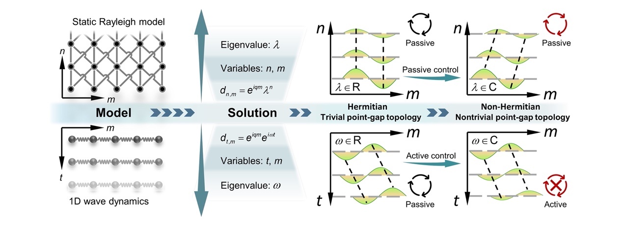 但一个广为接受的共识是,与外界保持持续能量交换的开放系统是研究非厄米拓扑行为的一个不可或缺的条件,而构建具有拓扑效应的非保守动态系统,无论是在宏观的力学、电磁、声学系统和生物群落,还是微观的量子系统,都并非易事。如能在静态的保守系统中实现非厄米拓扑行为,将会为非厄米拓扑力学和物理研究带来巨大方便。