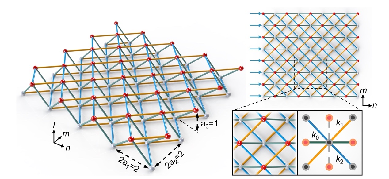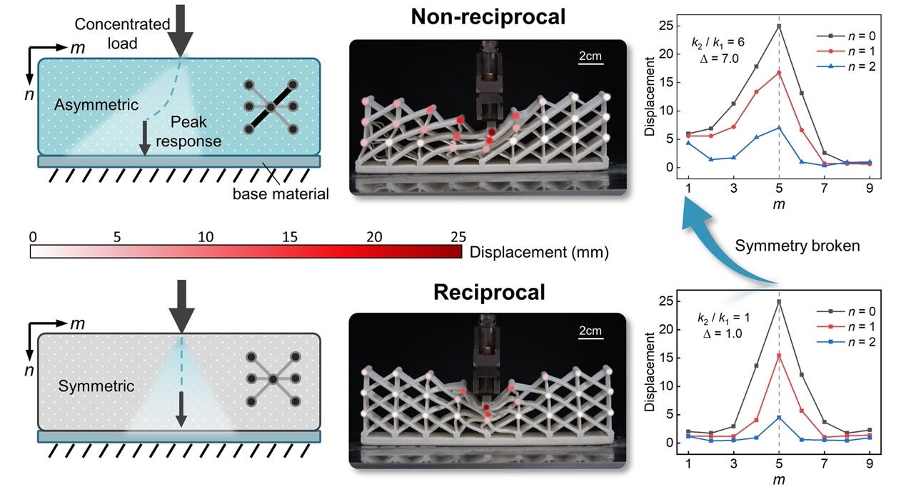 最近,mk手机注册航天航空学院陈常青教授课题组利用力学超材料点阵结构,将低维非保守系统中的弹性波时域动力学演化行为,等效映射为空间尺度上高维点阵结构的静态变形模式,从而在一个静态的保守系统中实现了非厄米拓扑效应(图1)。相较于非厄米动力学系统,该静态系统中仅通过改变点阵的几何构型便能实现非厄米及等效非互易效应,而无需任何主动调控或能量注入,极大地降低了非厄米效应的触发条件(图2)。
