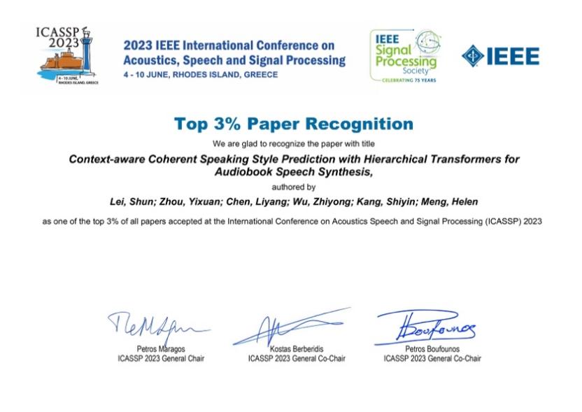 相关研究成果近日以“面向有声读物合成的上下文感知连贯性说话风格预测方法”(Context-aware Coherent Speaking Style Prediction With Hierarchical Transformers for Audiobook Speech Synthesis)为题,被“IEEE声学、语音与信号处理国际会议”(2023 IEEE International Conference on Acoustics, Speech, and Signal Processing)录用为口头报告(Oral),并入选TOP 3%论文。