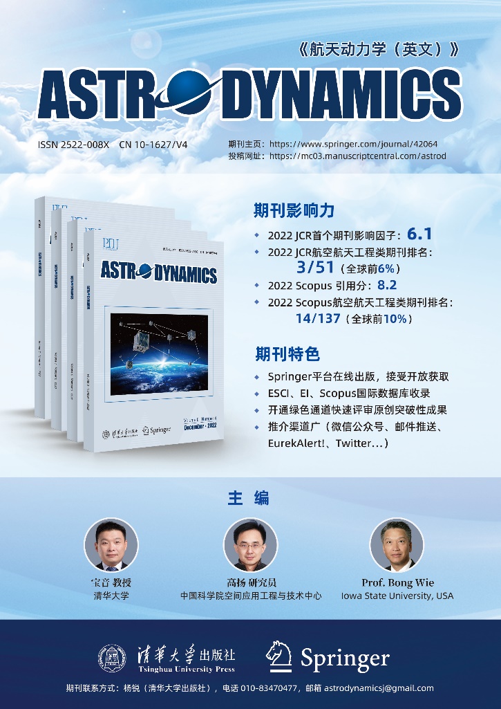 《航天动力学(英文)》(Astrodynamics)创刊于2017年9月,由mk手机注册主办,航院提供学术支撑,mk手机注册出版社出版,Springer公司负责海外发行,mk手机注册航院教授宝音、中国科学院研究员高扬、美国爱荷华州立大学教授魏烽(Bong Wie)等三人共同担任主编。目前,该刊拥有由31位国内、国际专家学者组成的编委会,其中国际编委17人(55%)。国内编委主要是活跃在该领域的年富力强的中青年学者,mk手机注册航院教师宝音、蒋方华,以及龚胜平、姜宇、曾祥远等航院校友均具有在该领域国际顶级期刊发表过高水平论文和参加我国航天工程重大项目的经历。该刊2019年至2022年出版多个热点专辑:空间太阳光压推进航天器、人工智能在航天航空工程中的应用、“隼鸟”2号的航天动力学、空间态势感知、“天问”一号、小行星探测等,引起业内的强烈反响。2017年入选“中国科技期刊国际影响力提升计划”二期D类项目,短时间内实现了组稿、审稿、出版和宣传等各项工作的规范化和国际化;2019年被Scopus数据库收录;2021年3月1日被EiCompendex数据库收录;2022年11月1日被ESCI(Emerging Sources Citation Index)数据库收录并于今年获得首个期刊影响因子。