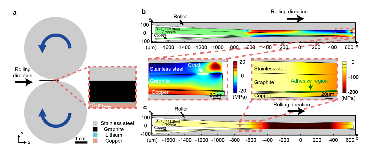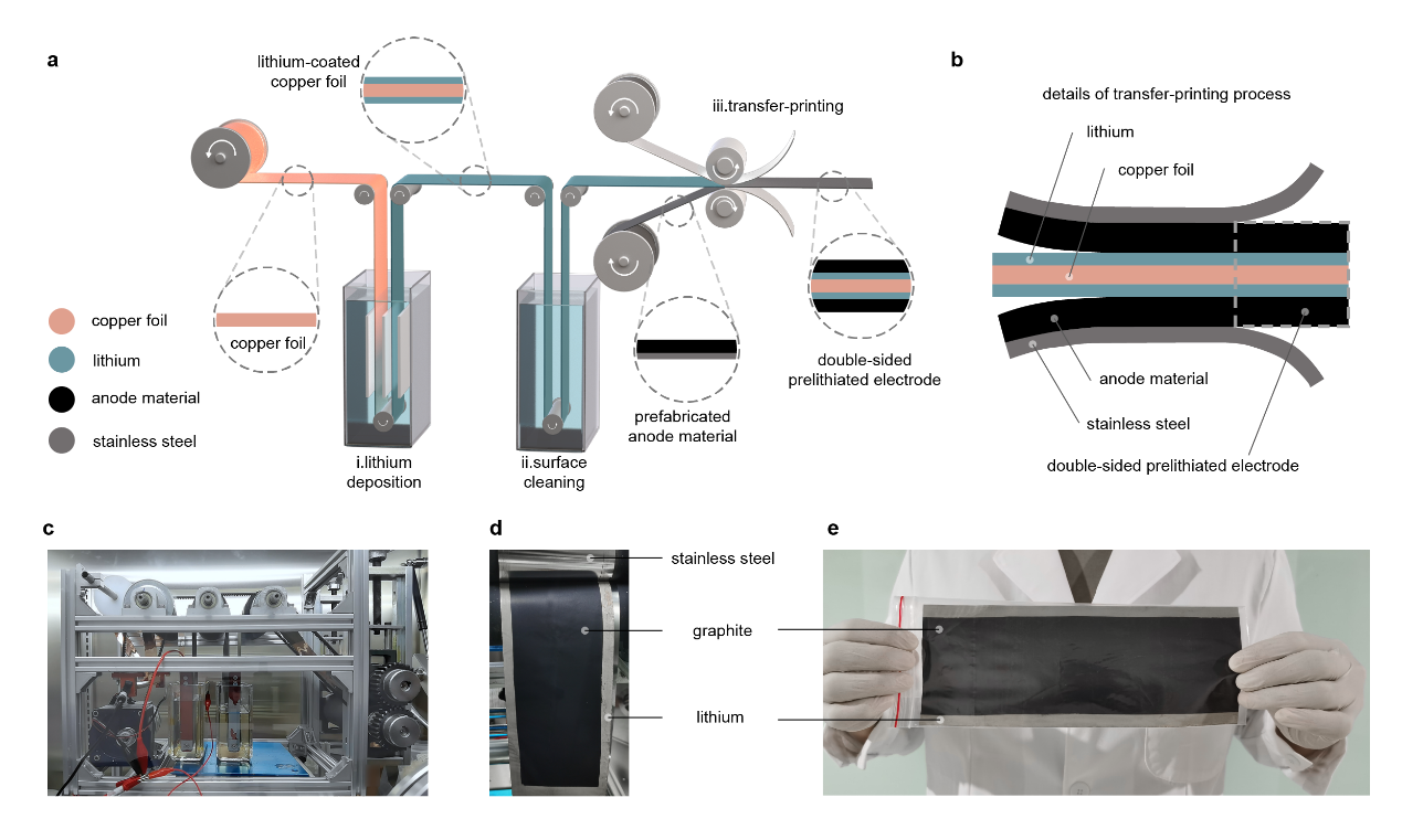该方法通过调控电沉积参数,使精确可控的锂沉积在集流体上。利用沉积锂和负极层之间的强结合力,采用电极转印工艺将活性材料转移到电极上。利用该技术,成功制备了预锂化的石墨负极和硅碳复合材料负极,将其初始库仑效率提升至接近100%,并保证了良好的稳定性以及更好的倍率性能。预锂化电极可大幅度提高镍钴锰三元氧化物和磷酸铁锂全电池的初始库伦效率和能量密度。通过有限元模拟研究了界面分离与粘合的过程,研究结果表明,转印过程中产生的剪切应力促进了界面的分离,从而实现了电极层的转印。在此基础上,基于有限变形理论建立了相关的理论模型,预测了电极转印发生的临界压缩应变。基于理论分析和相关实验结果,研究团队设计了用于预锂化负极连续生产的卷对卷电沉积和转印系统,实现了从集流体到预锂化负极的连续生产,与传统的卷对卷电池制造工艺可以很好地匹配,具有极大的工业化应用价值。该方法利用电沉积方法实现了精确可控的预锂化,避免了昂贵的预锂化锂源的使用,对各类电极活性物质具有普适性,并且具备与传统电极制备工艺的良好匹配性以及工业可扩展性。