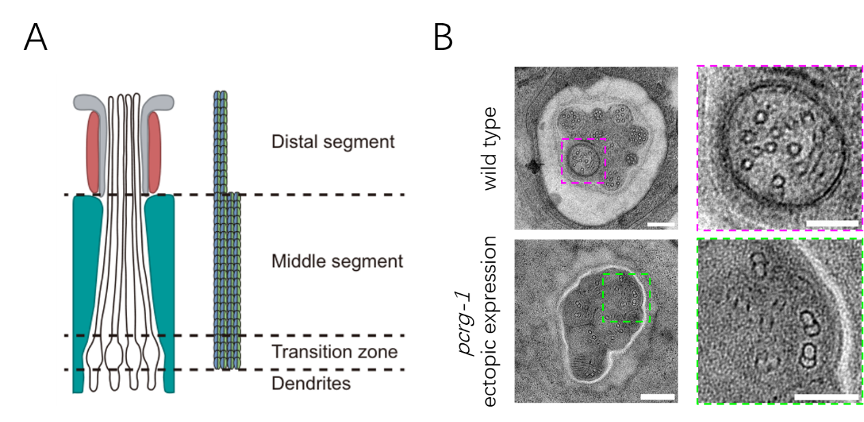 (A)线虫感觉神经纤毛结构示意;(B)异位表达内连结蛋白PCRG-1导致远端段异常生成双联体微管