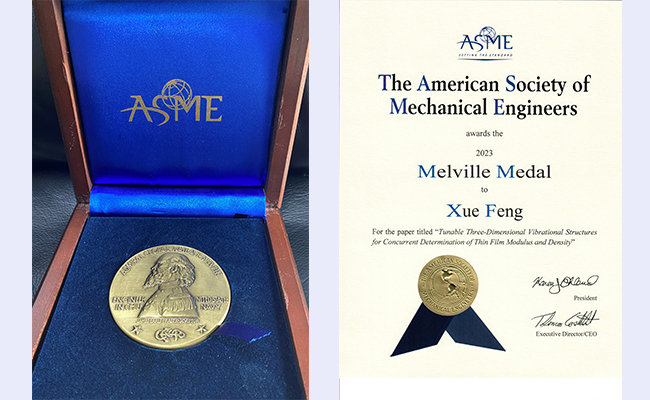 冯雪长期从事固体力学与柔性电子技术研究,本次梅尔维尔奖获奖论文题为“同时测定薄膜模量和密度的三维可重构振动结构”(Tunable three-dimensional vibrational structures for concurrent determination of thinfilm modulus and density),2022年发表于《应用力学杂志》(Journal of Applied Mechanics)。该论文利用柔性器件的形态可重构特性,提出了一种通过振动信号同时测定薄膜材料多个力学性能的方法,对于柔性集成器件关键功能材料性能表征具有重要意义,在生物力学、流体力学、生物医学工程中也具有应用前景。