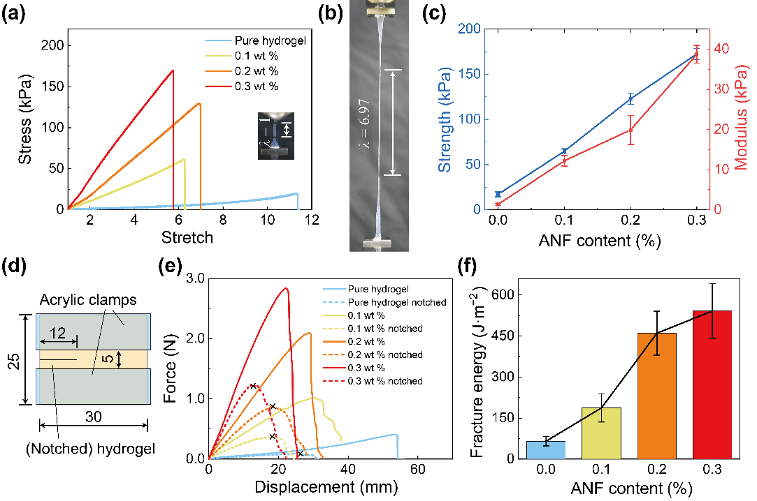 图2.芳纶纳米纤维增强的水凝胶复合材料的单轴拉伸和断裂能测试