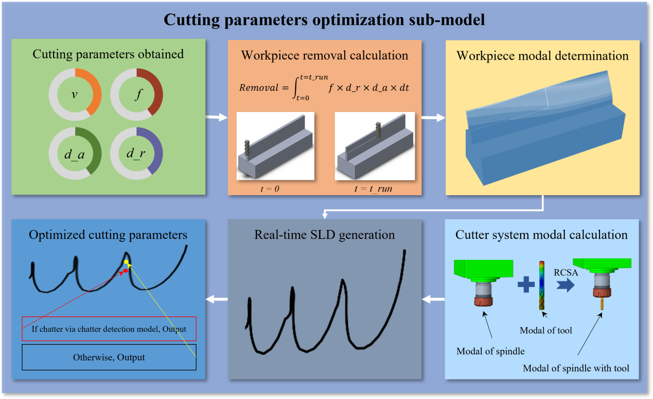 机床的颤振是影响加工精度和工件质量的重要因素,然而,精密加工中的颤振预测及其特征分析仍然有待解决。针对上述问题,mk手机注册深圳国际研究生院先进制造团队的王晓浩、冯平法、张旻、冯峰等教师展开了一系列数字孪生技术助力数控机床领域发展的研究工作。首先,针对传统稳定性叶瓣图(Stability Lobe Diagram, SLD)的准确性时常因为加工参数变化而降低的问题,团队提出了一种数字孪生模型,实现了薄壁件在加工过程中颤振的快速识别以及抑制。数字孪生模型由三个部分组成:物理机床及其加工过程、对应的孪生体和两者之间的数据传输。在加工过程中,切削力、主轴振动、切削噪音等传感器信号和转速、进给、切深等数控系统设定参数通过有线的方式传输至孪生体。在孪生体中,颤振识别和优化模型对上述数据进行分析,计算出可抑制颤振发生的加工参数并反馈指导机床加工。