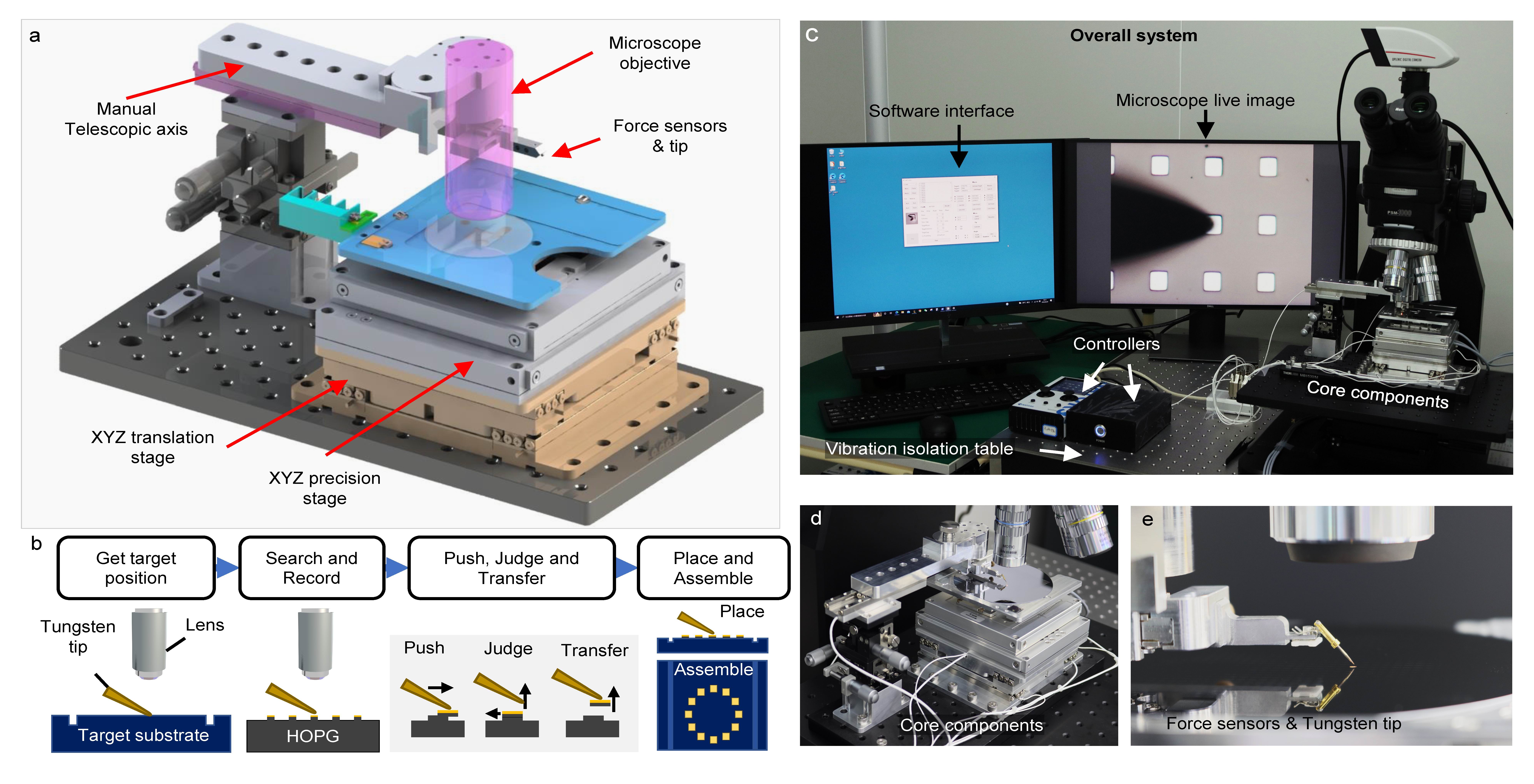 自动化系统的设计原理、功能和照片。(a)自动化系统核心组件的设计原理图,包括XYZ长程位移平台、XYZ精密位移平台、光学显微镜等。除手动显微镜轴外,所有组件均由软件控制。(b)微米级石墨片的转移过程示意图。首先,通过手动操作找到目标位置。然后,将光学显微镜对准石墨片,系统会自动寻找尖端并记录目标石墨片。然后,位移台和探针将石墨片推起并拾取。同时,系统会判断石墨片是否为具有自回复性质以及操作是否成功。最后,石墨片将被转移到目标位置。(c)整体系统的照片。(d)核心部件的特写。(e)力传感器和钨针尖