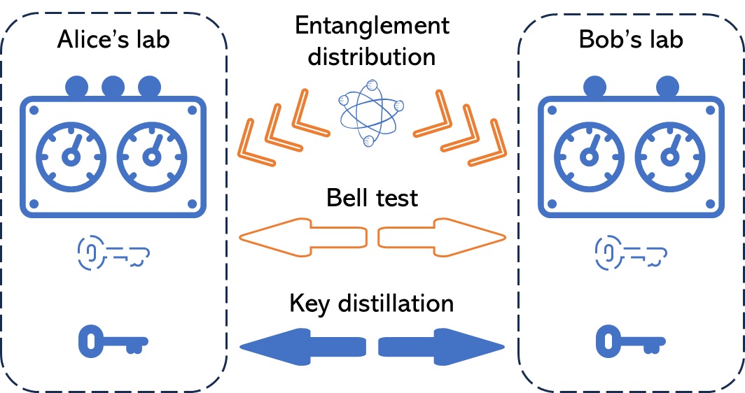 测量互补性原理和量子非定域性在量子通信与密码中发挥了重要作用。基于测量互补性原理,可以实现等具有信息论安全性的量子密码协议。另一方面,量子非定域性启发了仅基于量子力学正确性的密码协议设计。上世纪90年代,姚期智院士等研究者提出了通过贝尔不等式违背,实现具有设备无关特性的量子密码协议(图1)。然而,不同于使用可信设备的量子密码协议安全性分析,在设备无关量子密码学的发展中,测量互补性的作用并未得到明确。