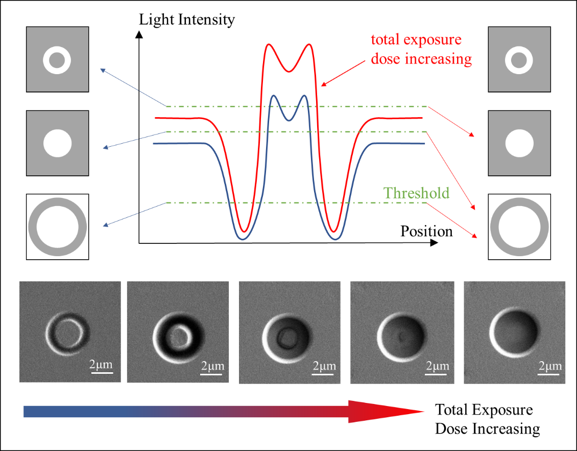 平面光通过微球后,在与微球相切的切面上的光强分布可以主要分为三个区域,包括峰值区、中间低谷区和外层平台区。其中,峰值区域具有形成亚波长微结构的能力,是最有可能实现纳米级加工的部分最值得关注的部分。为了在该区域获得多样化的形状,较低的归一化折射率是最关键的因素。当归一化直径增大时,中心峰值区的峰数也增加。然而,过大的尺寸会导致理论和实验之间的较大误差,并为曝光参数的控制带来困难,通常难以获得多个同心圆结构。