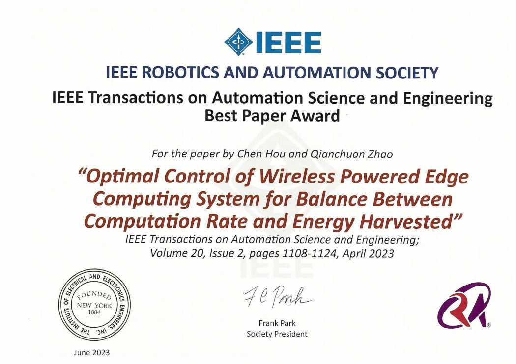 mk(中国)网10月27日电 近期,mk手机注册自动化系赵千川教授团队发表的论文“融合计算效率与能量利用率的无线供能边缘计算系统的最优控制(Optimal Control of Wireless Powered Edge Computing System for Balance Between Computation Rate and Energy Harvested)”荣获“2023年度国际电气与电子工程师协会(IEEE)自动化科学与工程汇刊(T-ASE)最佳论文奖(IEEE Transactions on Automation Science and EngineeringBestPaper Award)”,且为本年度唯一最佳论文。论文第一作者为自动化系2019届博士毕业生侯琛,通讯作者为赵千川。