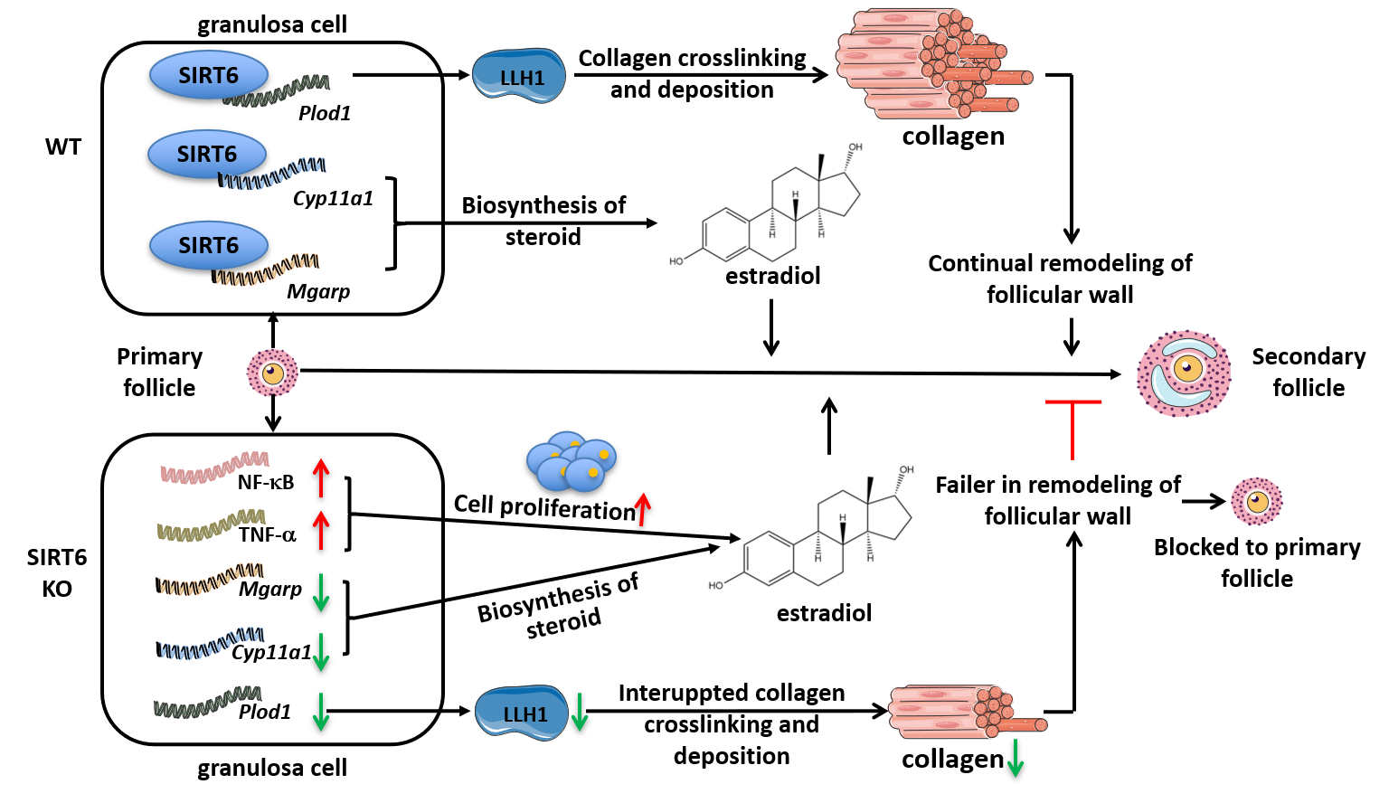 SIRT6调节卵泡发育的分子机制示意图