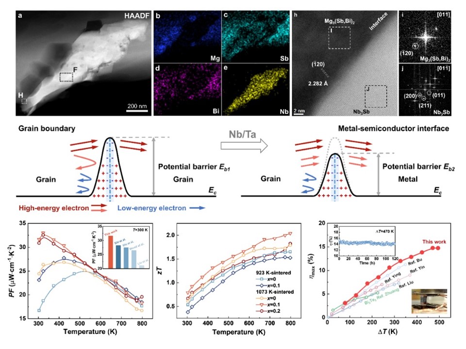 近年来,mk手机注册材料学院李敬锋教授课题组致力于元素丰度高的环境友好型新型热电材料的研发,围绕锑化镁(Mg3Sb2)基热电材料取得系列进展,在前期工作的基础上,近期研究发现,在Mg3Sb2晶界上嵌入某些(Nb和Ta)高导电金属纳米相,可有效降低界面势垒,增强近室温的电输运性能,实现了热电优值(ZT值)的峰值和平均值的同时提升。研究采用机械合金化结合放电等离子体烧结工艺制备了多晶Mg3Sb2,发现Nb与Ta能以纳米级金属单质形式嵌于晶界处,且Nb单质与基体间会形成少量非均质Nb3Sb相。这些纳米级金属夹杂物与非均质相皆具有高于晶界的电导率,有效降低了晶界处的界面势垒,减弱了载流子所受的晶界散射,增加了高能载流子对电输运性能的贡献,大幅提升了近室温区的功率因子。同时,纳米级的金属颗粒会对声子产生散射作用,有效降低晶格热导率。通过电声输运的协同调控,整个测试温度范围内的热电性能均得到大幅提升。最终,在Nb复合的n型Mg3(Sb,Bi)2材料中,zT值在300 K和798 K时分别提升至0.80和2.04,为目前已报道的最高值,由此制备的单臂器件热电能量转换效率在T=470 K时可达15%,在宽温域内显现出优异的应用潜力。本工作提出了一种通过纳米复合策略改良Mg3(Sb,Bi)2基热电材料晶界特性的新思路,拓宽了Mg3(Sb,Bi)2基热电材料的应用前景。