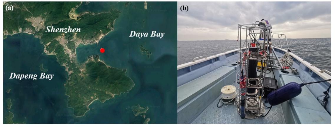 图1.样机在大亚湾投放的地点(a)以及投放前(b)