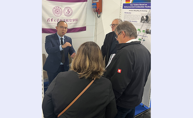 王兵团队成员向参会专家介绍所参展的发明“基于自增压燃烧技术的动力单元”项目