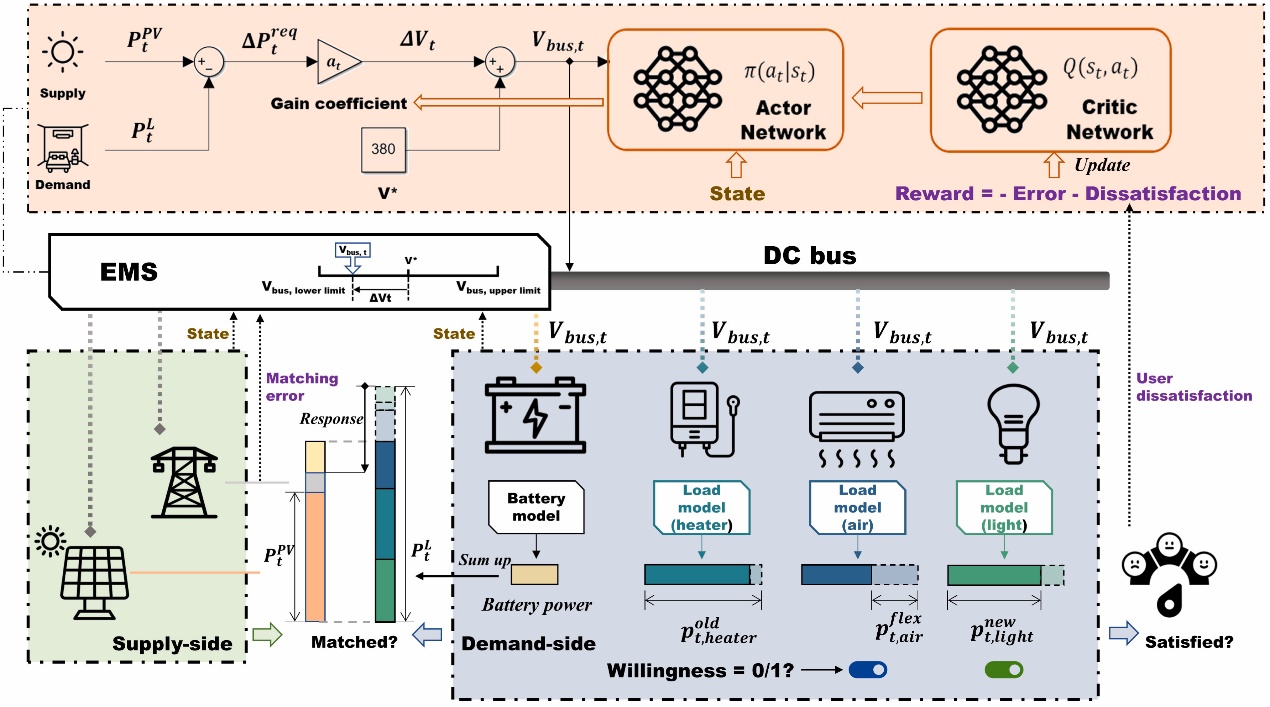 DC-RL设计了一个分布式直流能源系统,建立了柔性电器、储能电池、电动汽车柔性需求响应模型,控制系统通过直流母线电压信号直接驱动终端设备协同实现无级柔性需求功率调节,降低通信复杂度和成本,极大程度地提升了负载的可扩展性。同时,用户可以根据自身意愿调整参与柔性功率调节的负载种类和数量;系统可以在不同程度的用户意愿参与度下进行柔性调节。