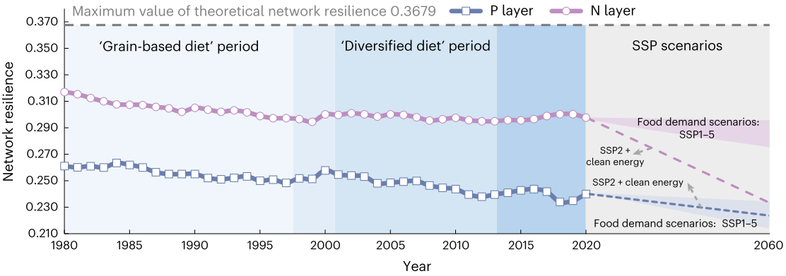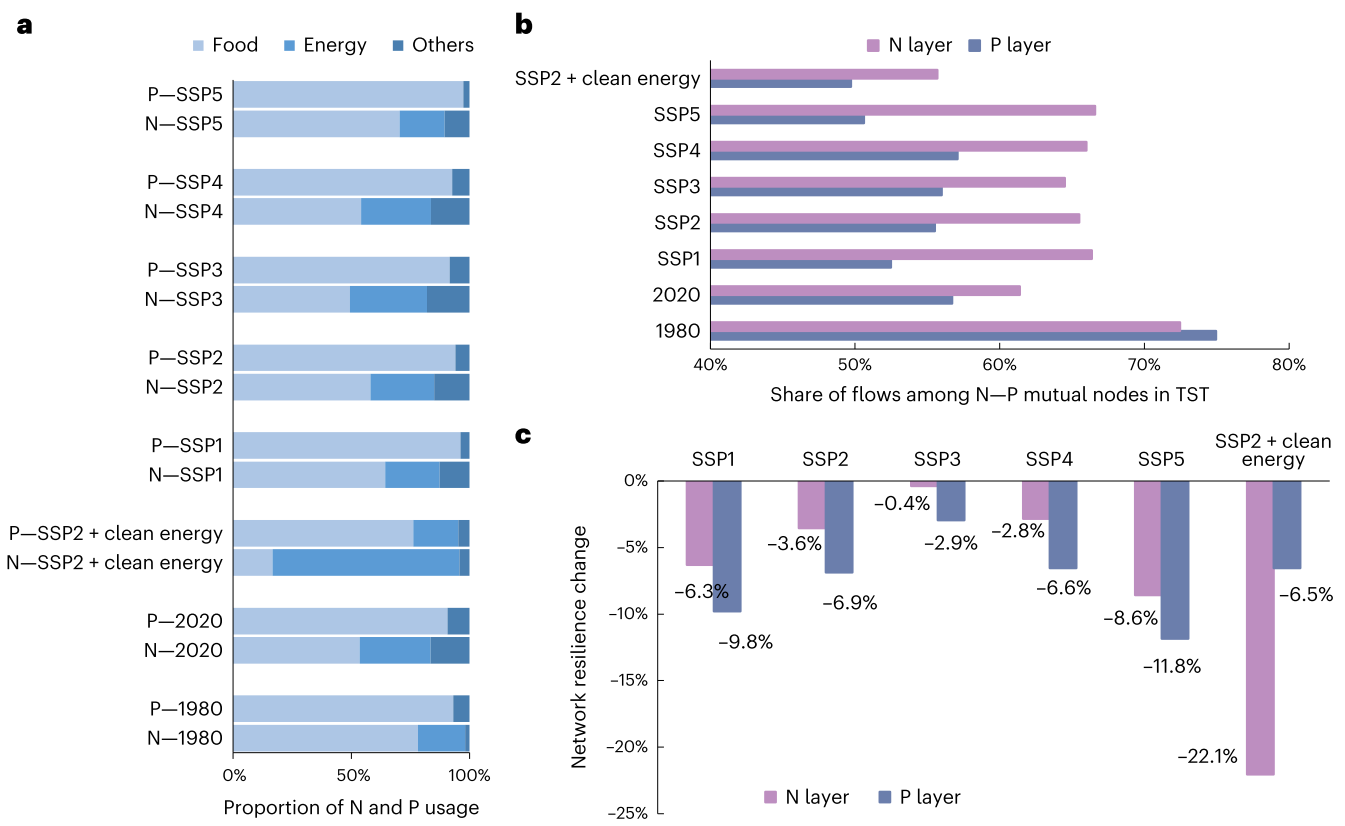基于共享社会经济路径(SSP)情景,联合团队还预测了中国2060年的氮-磷耦合循环网络及其韧性。研究表明,在SSP2+清洁能源情景下,中国的氮-磷耦合循环网络将受到绿氨和锂电池等清洁能源需求的驱动而发生代谢规模和代谢路径变化。清洁能源需求对氮网络层影响较大,而食品需求对磷网络层影响更显著。清洁能源需求会导致更多的流量集中在氮和磷特有节点,削弱了氮网络层和磷网络层之间的耦合强度。如无任何调控措施,中国氮-磷耦合循环网络的韧性将进一步降低(特别是氮网络层),不仅会降低氮-磷耦合系统抗风险冲击能力,从而威胁到中国的粮食安全,而且还可能会向环境排放更多的活性氮,从而扰乱氮元素循环,加剧能源和粮食系统之间的冲突。
