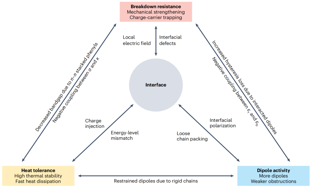 沈洋课题组首先从纳米技术的角度综述了高温储能聚合物电介质领域的研究现状。根据影响聚合物电介质高温能量密度的三个关键因素“介电常数”“击穿场强”和“热稳定性”,梳理了提高其高温能量密度的主要研究方向,包括提升介电常数的关键在于增加偶极子数目和减弱偶极子取向阻碍,增强击穿场强需要侧重电介质的机械增强和电荷捕获,保障性能热稳定性需要兼顾高结构热稳定性和快速热导。基于上述研究方向,课题组介绍了不同尺度的纳米技术,如宏观层面的纳米级表面包覆、填料层面的纳米填料掺杂、链段层面的聚合物交联、单体层面的聚合物结构设计等。此外,课题组还对高温储能聚合物电介质的未来发展方向进行了展望。