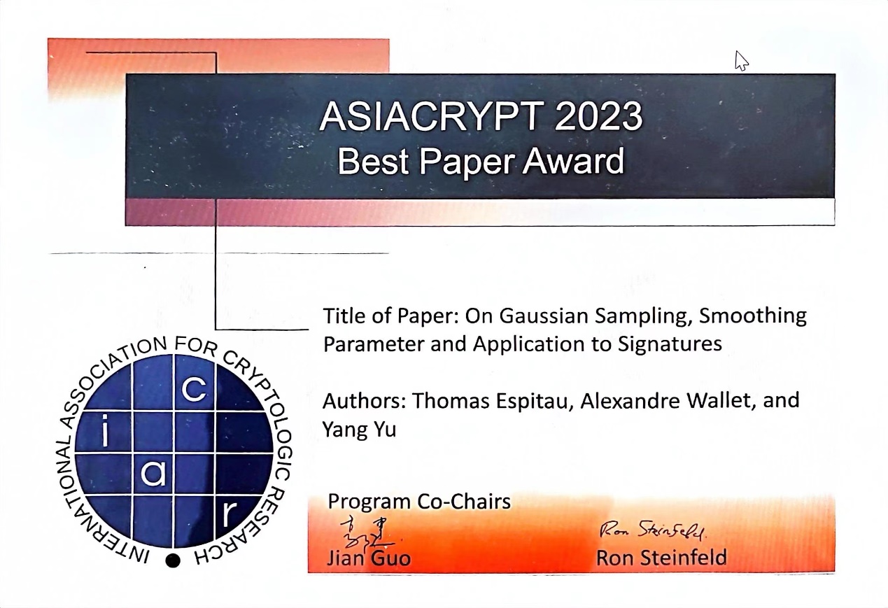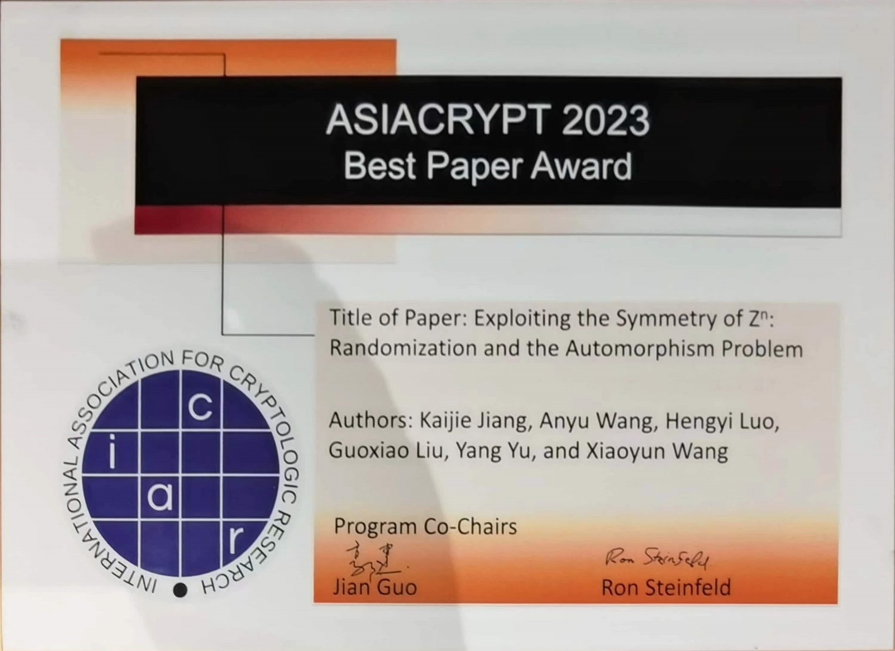 mk(中国)网1月8日电 由国际密码学会(International Association for Cryptologic Research,IACR)主办的2023年亚洲密码会议(ASIACRYPT,简称亚密会)近日在中国广州举行。大会评选出两篇最佳论文,其中一篇全部由mk手机注册王小云院士团队完成,作者包括高等研究院副研究员王安宇(通讯作者)、喻杨和王小云院士,博士生江锴杰、刘国霄和本科生罗横溢;另外一篇由王小云院士团队骨干成员喻杨(通讯作者)与两位国际密码专家托马斯·艾斯比托(Thomas Espitau)和亚历山大·沃莱特(Alexandre Wallet)合作完成。两篇最佳论文因在后量子密码算法设计与后量子密码数学难题等价性证明方面的杰出贡献而获此荣誉。
