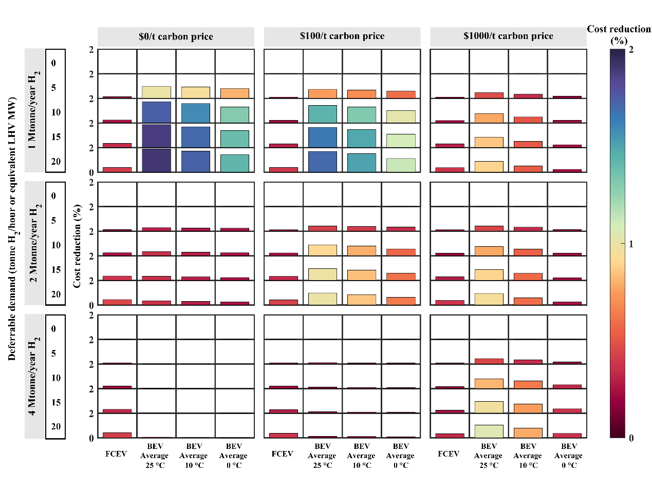 该研究将电动汽车和燃料电池汽车对低碳能源系统的灵活性价值量化为电动汽车灵活充电和燃料电池汽车灵活加氢对能源系统最低成本的降低值。通过跨尺度优化模型分别优化能源系统参数和调度,得到电动汽车和燃料电池汽车灵活充电或加氢前后系统的最低成本,进而量化得到两种交通电动化途径对低碳能源系统的灵活性价值。特别之处是,为考虑不同温度和充电速率下电动汽车电池退化引起的成本增加,基于电池微观多孔电极模型仿真计算不同使用工况下电动汽车电池的容量衰降,并转化为电池退化成本计算进能源系统多行业耦合的宏观优化模型中。使用提出的跨尺度优化模型,设置包括不同电池充电模式、电池使用温度和替换成本、不同政策(如不同氢能源发展途径和碳价格)等的多个场景分析电动汽车和燃料电池汽车在为低碳能源系统提供灵活性价值方面的相对优劣。