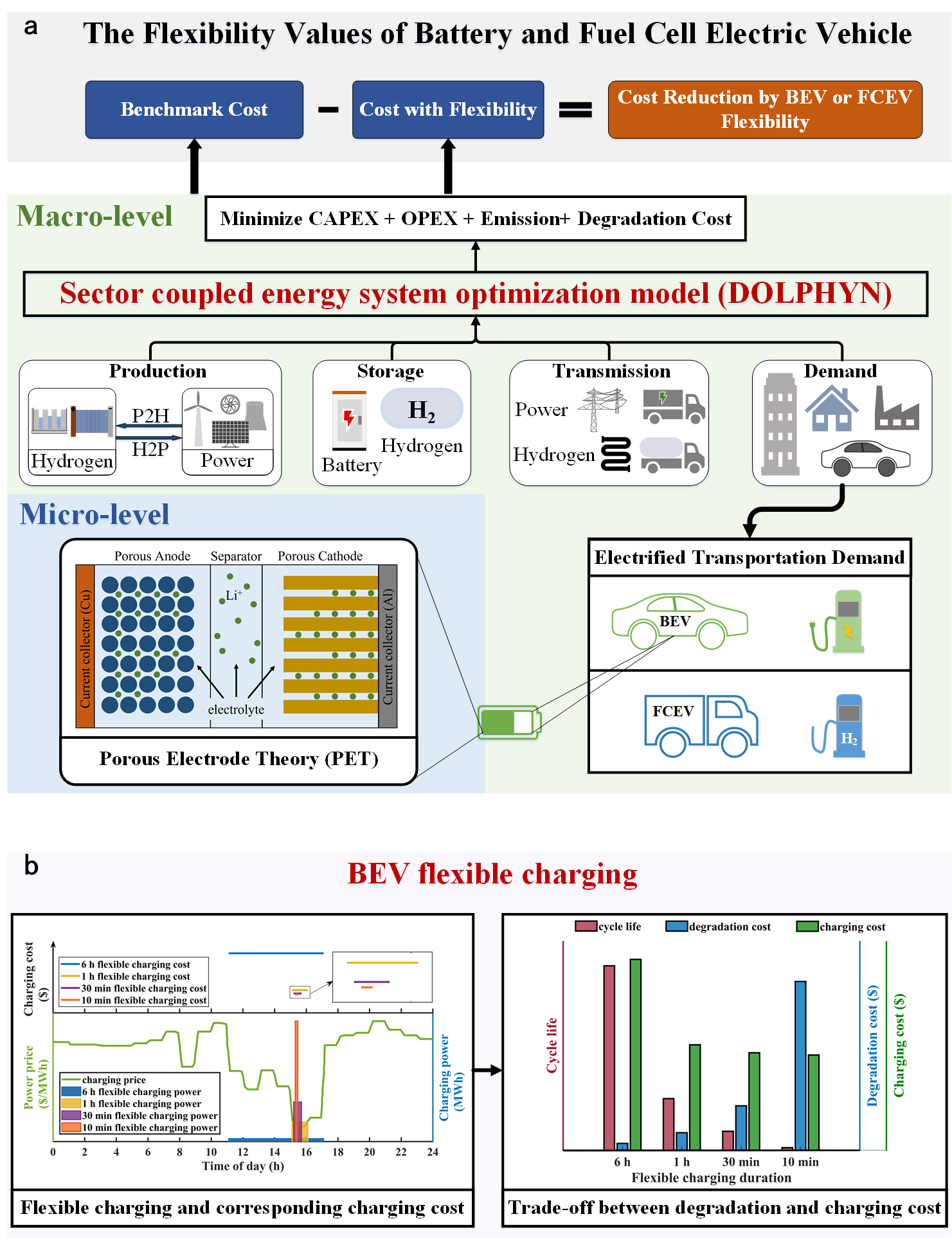 相关研究成果以“一种跨尺度能源优化框架用于评估纯电动汽车与燃料电池汽车的灵活性价值”(Across-scale framework for evaluating flexibility valuesofbattery andfuelcellelectricvehicles)为题,于1月4日发表在《自然·通讯》(Nature Communications)期刊上。