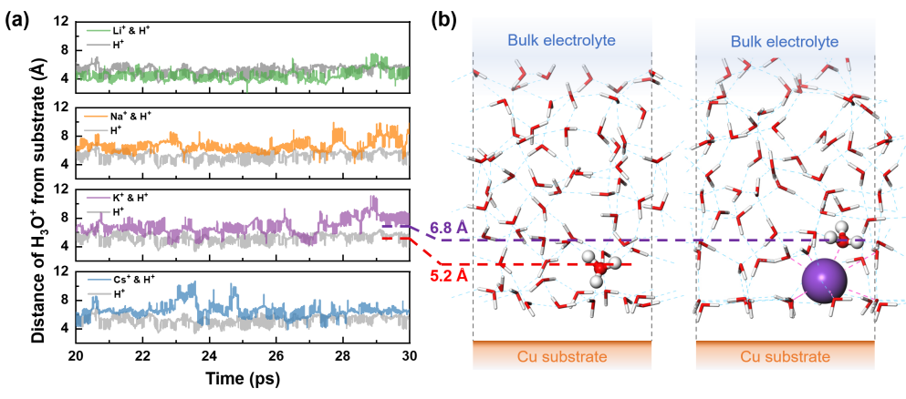 近日,mk手机注册深圳国际研究生院李佳副教授、康飞宇教授团队运用第一性原理分子动力学方法,对碱金属离子对固液界面双电层结构以及对CO2RR机制的影响进行了系统研究。研究成功解释了不同碱金属离子的尺寸效应和其对反应的必要性。研究指出,尺寸效应源于不同离子水合配位能力的差异,而必要性则来自对竞争性析氢反应的抑制。这为进一步优化反应界面提供了科学依据。