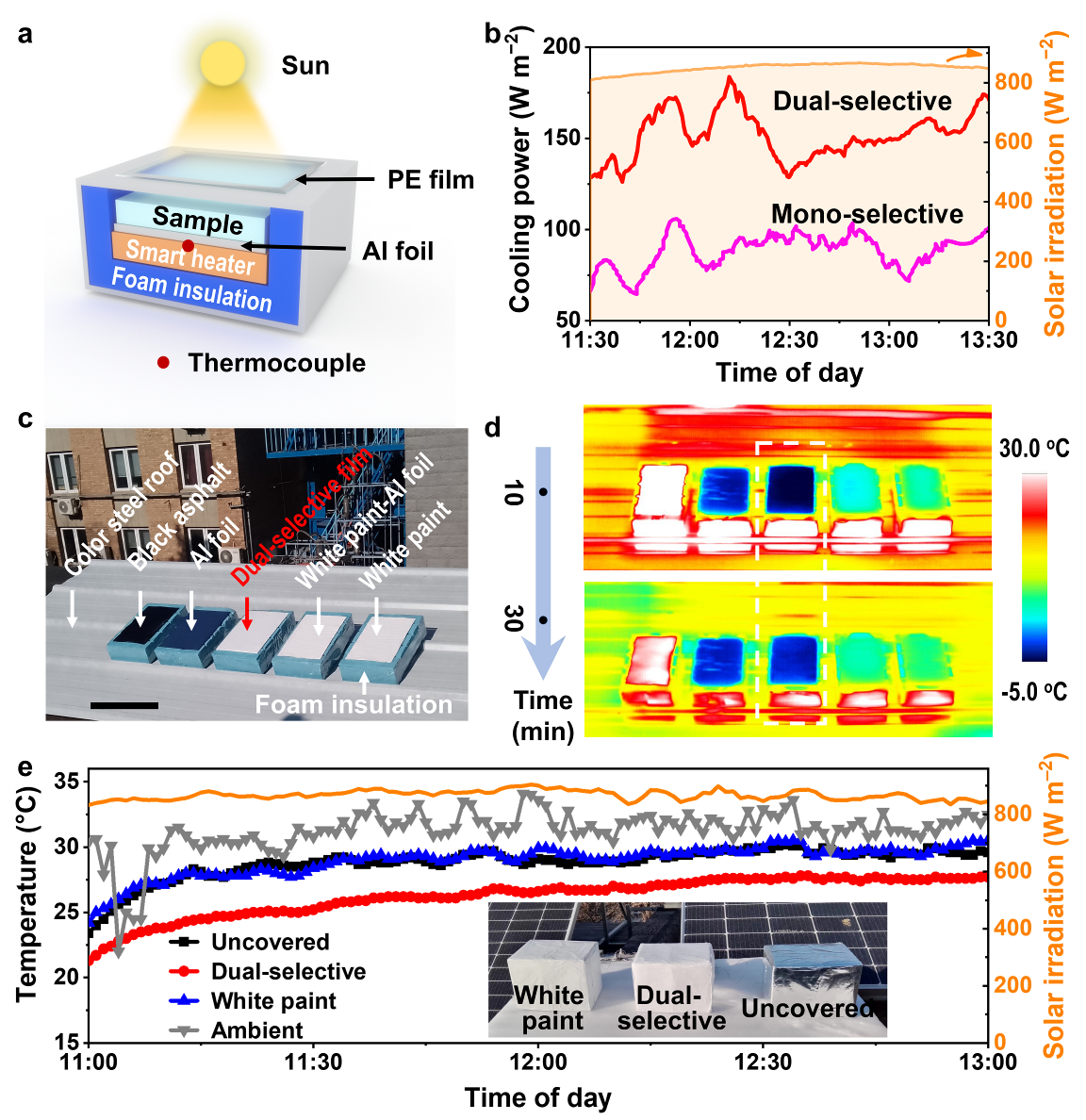 该研究从理论上提出并从实验上实现了一种具有更高制冷性能且可拓展的辐射制冷设计,也为将来设计更多高效热管理材料提供了新的思路。