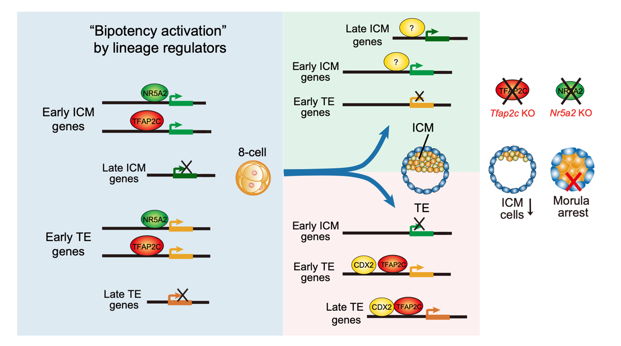 TFAP2C与NR5A2在早期胚胎第一次细胞命运决定前后的功能示意图