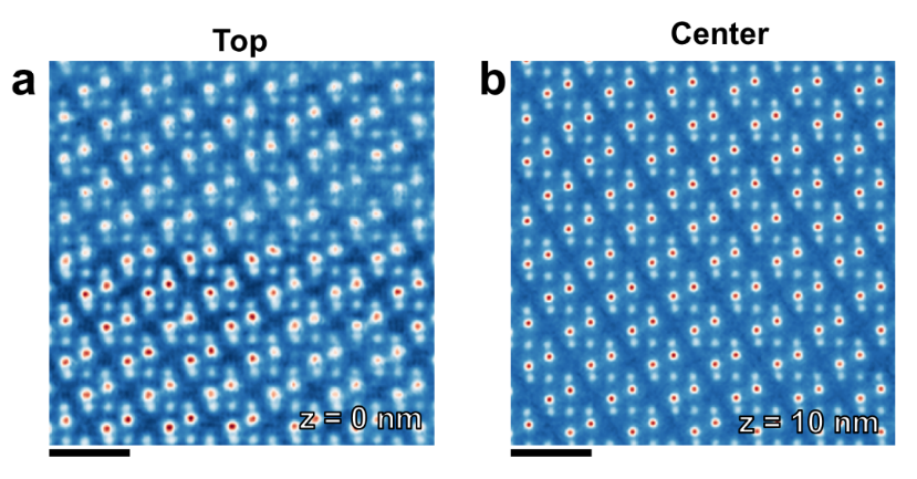 图2.实验样品的表面不可避免存在空位和台阶等表面缺陷。(a)和(b)分别为样品表面和内部的相位像