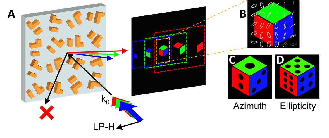 图5:基于双奇异点的非对称全彩矢量全息示意图。(A)通过使用PB相位,具有相同图案但不同大小的红绿蓝三色全息图像在水平线偏光(LP-H)照明下以指定角度重叠,(B)从而在感兴趣的区域产生任意(C)方位角和(D)椭偏率的非对称全彩矢量全息图。