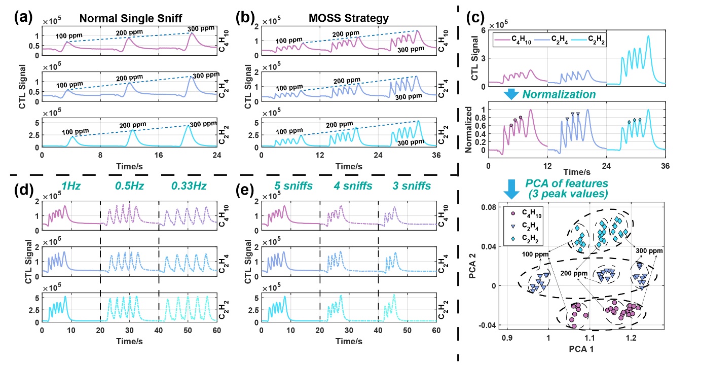 该研究首先针对挥发性有机物气体(VOC)辨识进行探究。研究者在单个CTL传感器上对三种不同浓度的VOC气体(乙烯、乙炔、丁烷)展开检测,分别使用传统单次进样方法与MOSS策略进行采样。实验表明,在传统气体进样方法下,该CTL传感器响应幅值与气体浓度成正比,而无法提取有效的VOC种类信息。在所提供的MOSS策略下,该CTL传感器的时序信号波形具有明显的区分度。实验证明,将时序信号的相对峰值作为特征向量,可直接通过主成分分析,同时辨识VOC气体种类与浓度,而无需额外的机器学习算法。
