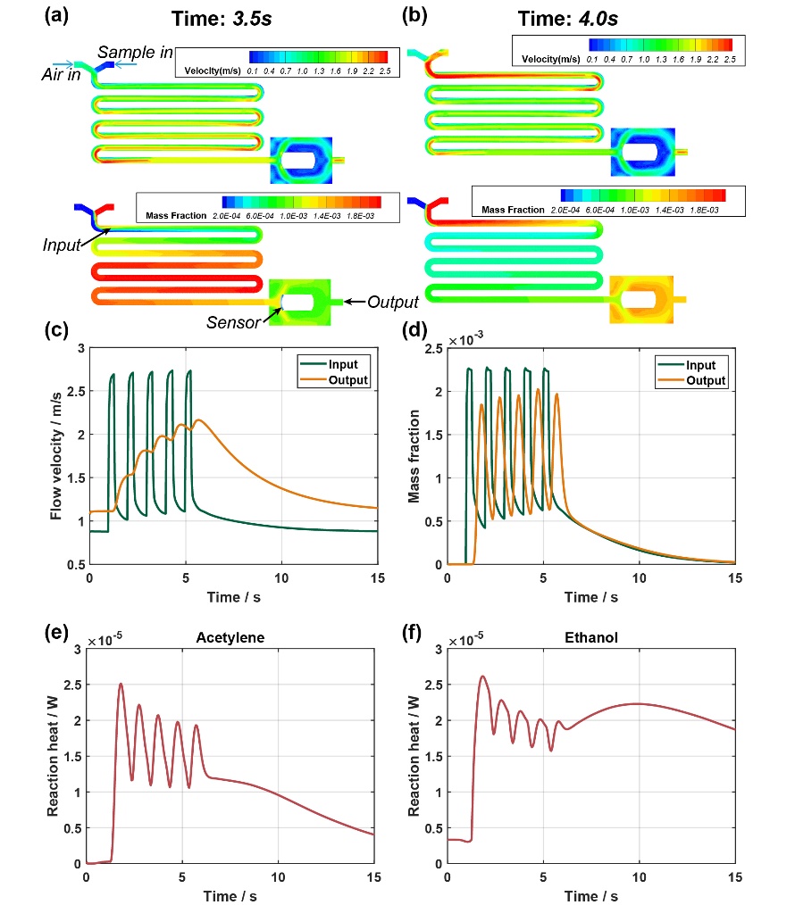 针对MOSS策略的动力学原理,该研究进行了计算流体动力学仿真验证。验证结果说明,由于同一CTL传感器对不同气体成分的响应方程及参数并不相同,这一差异在MOSS策略引发的动态气流下会直接导致时序传感信号的波形差异,从而有助于模式识别算法从传感信号中提取特征数据并辨识不同气体成分,这为研究所提的MOSS策略提供了明确的理论依据。