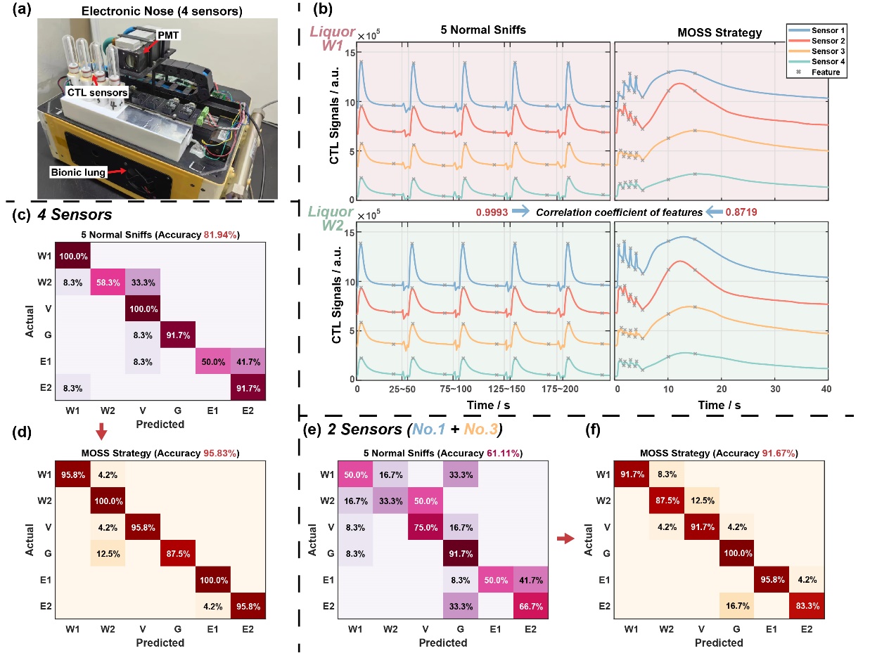 在研究中,研究者也针对不同烈酒种类辨识展开探究。研究者在4个CTL传感器组成的电子鼻上对6种烈酒展开检测,分别使用传统单次进样方法与MOSS策略进行采样。实验证明,相较于传统单次进样方法,MOSS策略可将该电子鼻设备对6种烈酒的辨识准确度从81.94%提升到95.83%,能够实现对不同烈酒种类的高准确度辨识。进一步实验表明,在仅有2个CTL传感器检测6种烈酒的限制条件下,传统单次进样方法的电子鼻仅能实现61.11%的辨识准确度,而MOSS策略可使该电子鼻实现91.67%的辨识准确度。以上实验说明了MOSS策略对电子鼻气味辨识能力的显著提升效果。