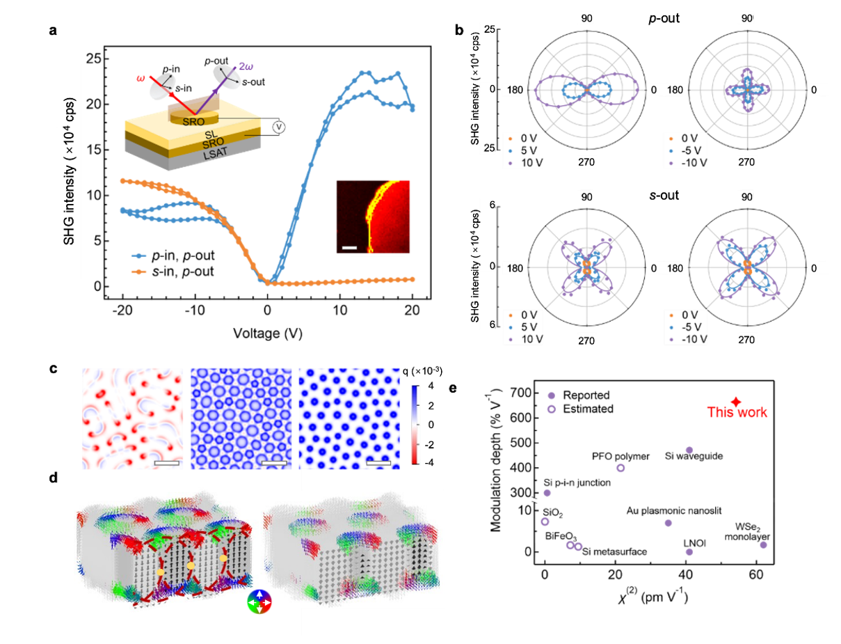 相关成果以“极性斯格明子的巨大电场诱导二次谐波产生效应”(Giant electric field-induced second harmonicgeneration in polar skyrmions)为题,近期在线发表于《自然·通讯》(Nature Communications)上。其中超晶格制备与非线性光学器件设计方法已提交PCT国际发明专利申请。
