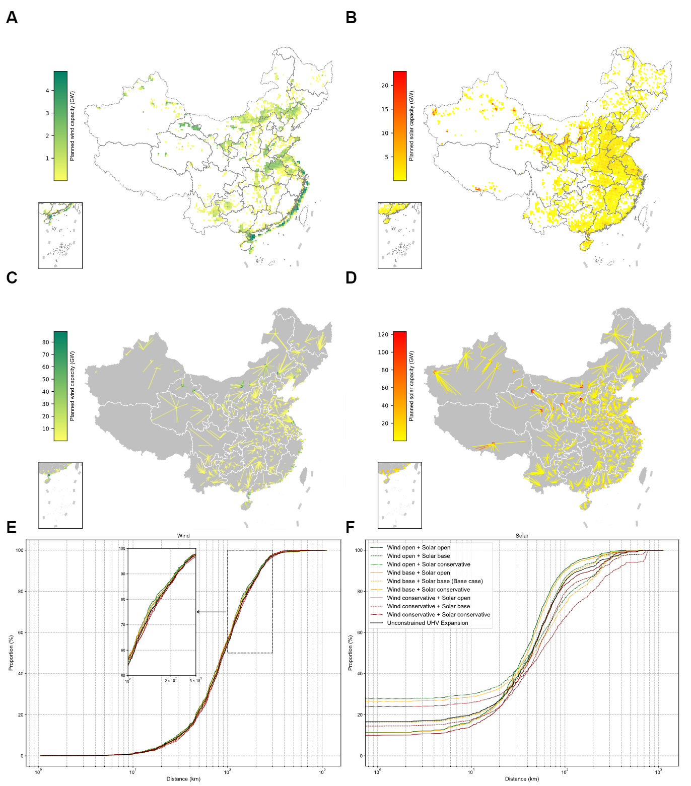 图1.RESPO模型在2060年碳中和背景下的风电光伏布局优化结果,(A)和(B):格点级风电与光伏的装机容量;(C)和(D):风电和光伏接入到各用电负荷中心的装机容量;(E)和(F):与接入的负荷中心距离—风电和光伏装机容量累计分布